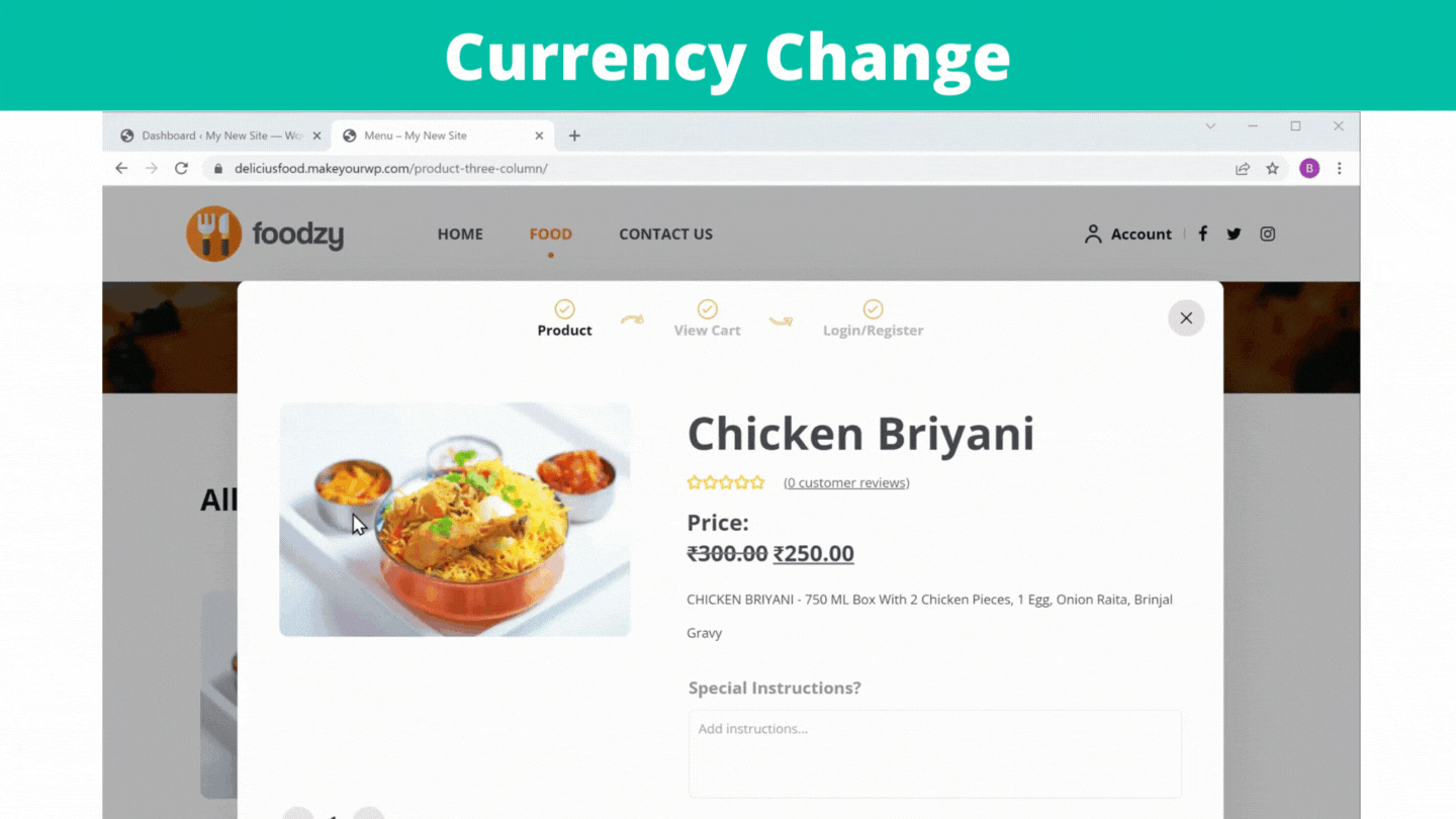 Now, if you go to your site and click refresh, you can see that you have got the search option and all features are added to your site. You can now place an order by clicking on any dish, selecting the quantity you want and click ‘Add to Cart’. Click on Checkout and here you can give your details and place the order.