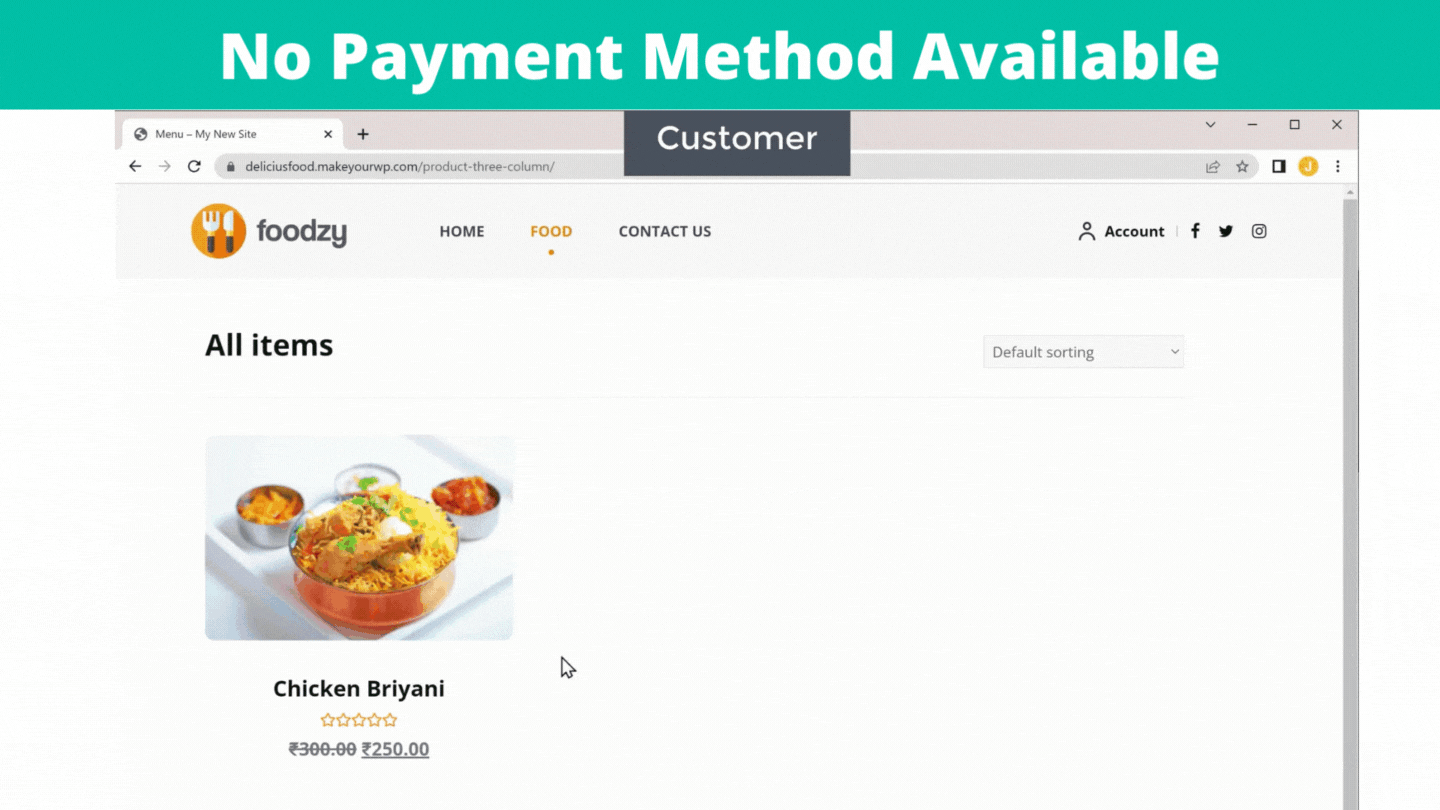 When a customer orders a food product and clicks “Add to Cart”, then on “Checkout”, it’ll ask them to create an account. So they can fill up their details and click Signup. They can enter their billing details. But here, you can see that “there is no payment method available”.