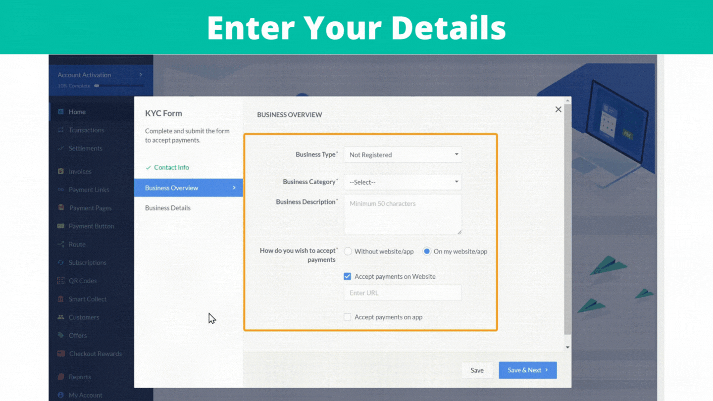 So to activate the account, click ‘Activate’. Next, you need to fill in these details such as business type, category, description of your business, average order value, how you would like to accept payments from your customers, your website URL etc. Once you are done, click ‘Save & Next’.