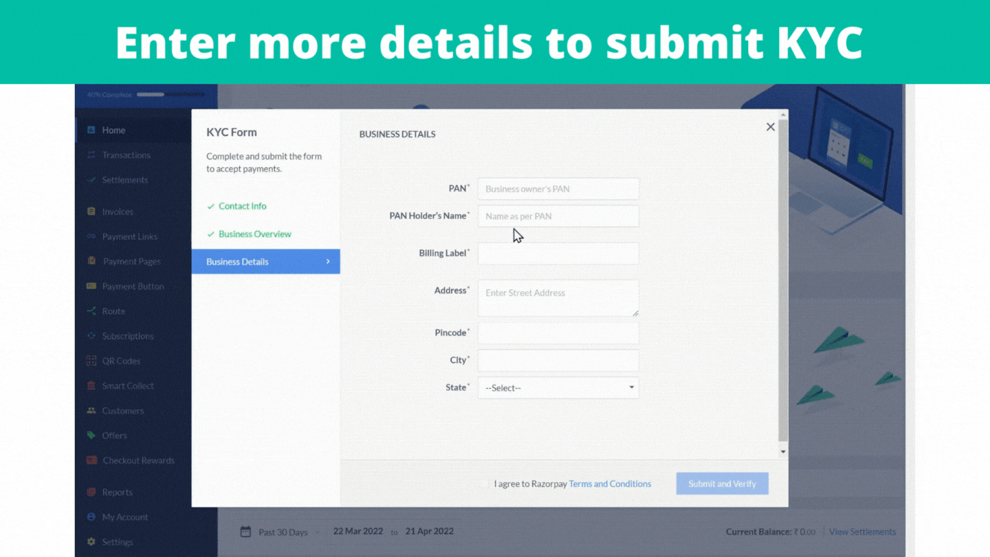 Next, you need to enter your business details such as your PAN number, name on your PAN card, name of your business which is the website name and address. Then, click on ‘Submit and verify’. You will get a box.