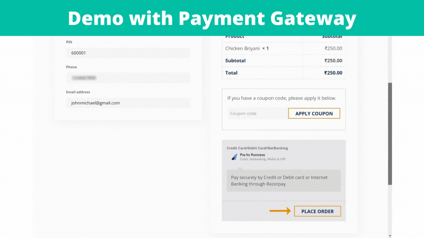 If you go back to the customer’s checkout page, you can see that payment is not available. But if you click ‘refresh’, you can see that the Razorpay payment has been added and your customers can make payments on your site. In addition, once they try booking an order, you can see that the order has been placed. They can also track their orders.