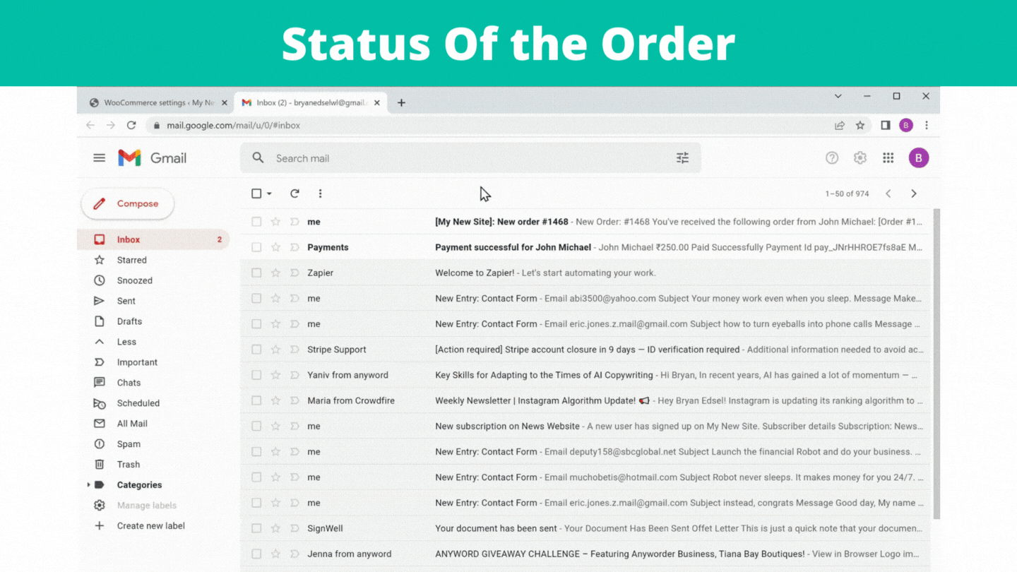 Now if the customer checks their inbox, you can see that they’ve received an email with an update about their order status.