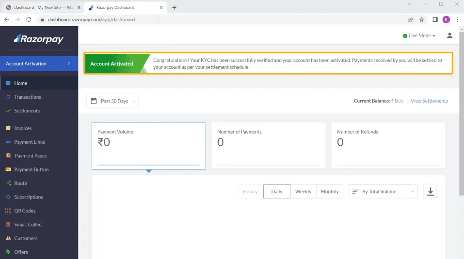 Once you have submitted the form, it will be verified within 3 to 4 working days. After four days if you go back to your account, you can see that your Razorpay account has been activated.