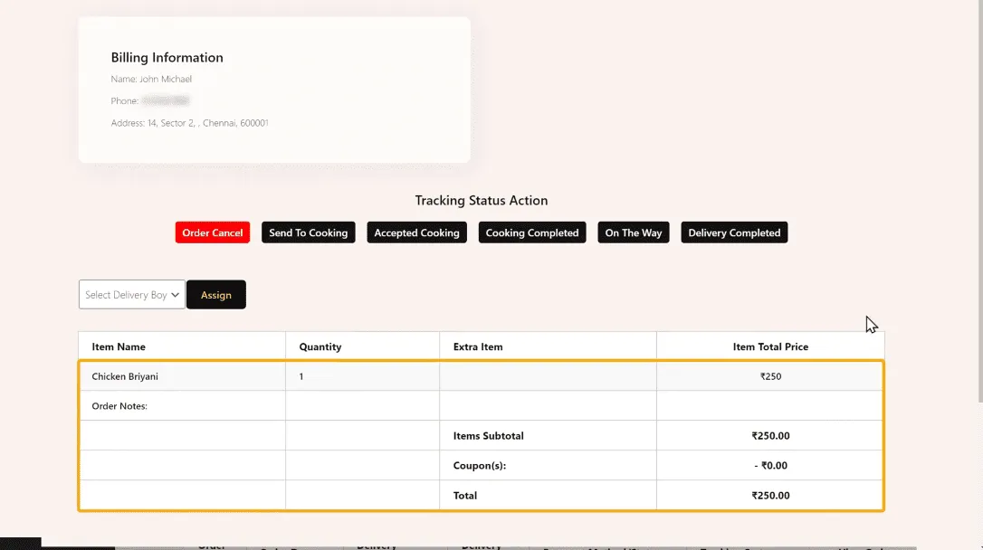 Now you can assign an order to the delivery person. Go to your Dashboard and click FoodBook. Click on View Details on the order you received. Click here, select the delivery person and click “Assign”. Once the order is assigned to him, the delivery person will get a notification. If the delivery person goes to their Dashboard and click