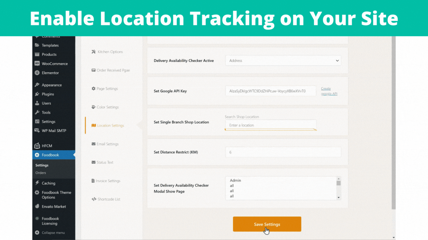 Now to enable the auto-filling feature, you need the Google API key. So go to your WordPress Dashboard and then go to FoodBook. Click on Settings and then go to Location settings to copy the API key. Now go to WooCommerce and click Autocomplete address for Woocommerce. Paste the Google API key here and click Save Changes.