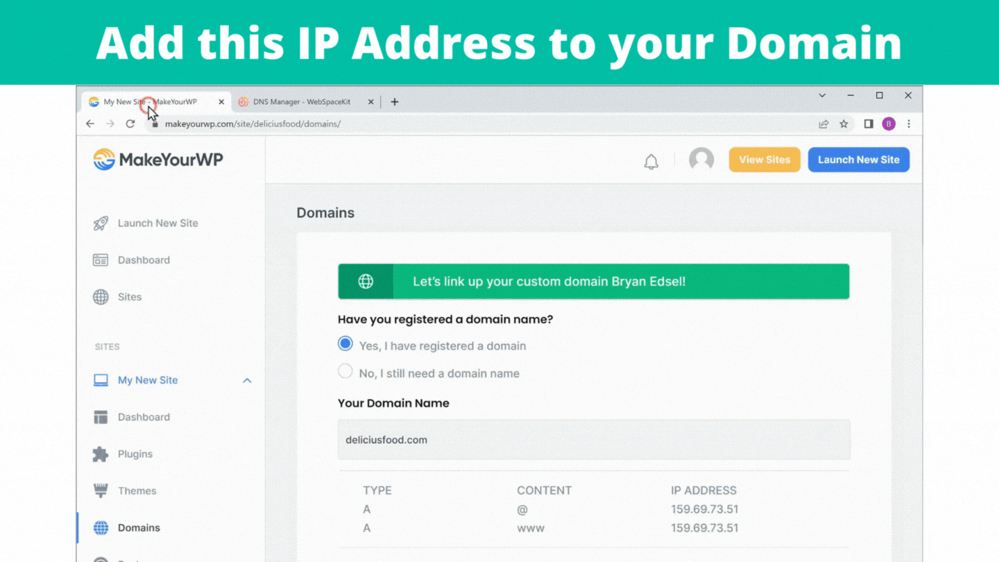 Click domains and select the domain which you purchased. Click “Manage DNS”, and next to the “A” record, you need to add your IP address. Go back, copy the IP address and paste it. Click save changes.
