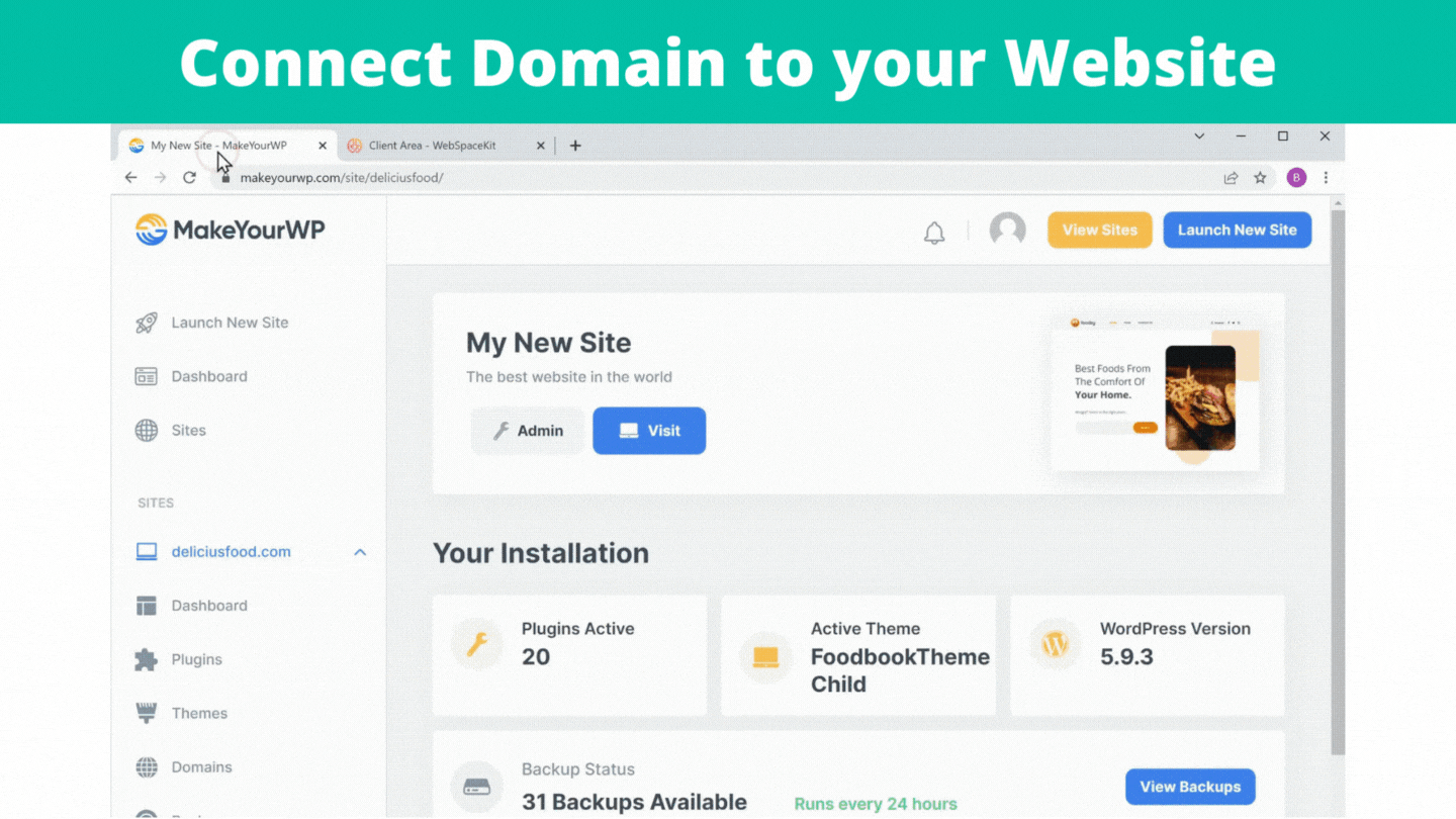 To connect the domain, go back to MakeYourWP to enter the name of the domain/website you purchased and click “Connect domain”. You’ve successfully connected your new domain name with your website. So to check it, open a new tab, type your new domain name and press enter.