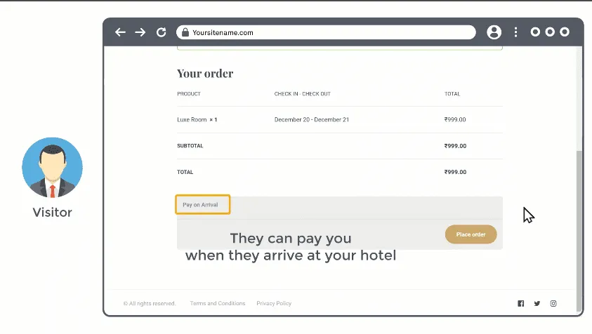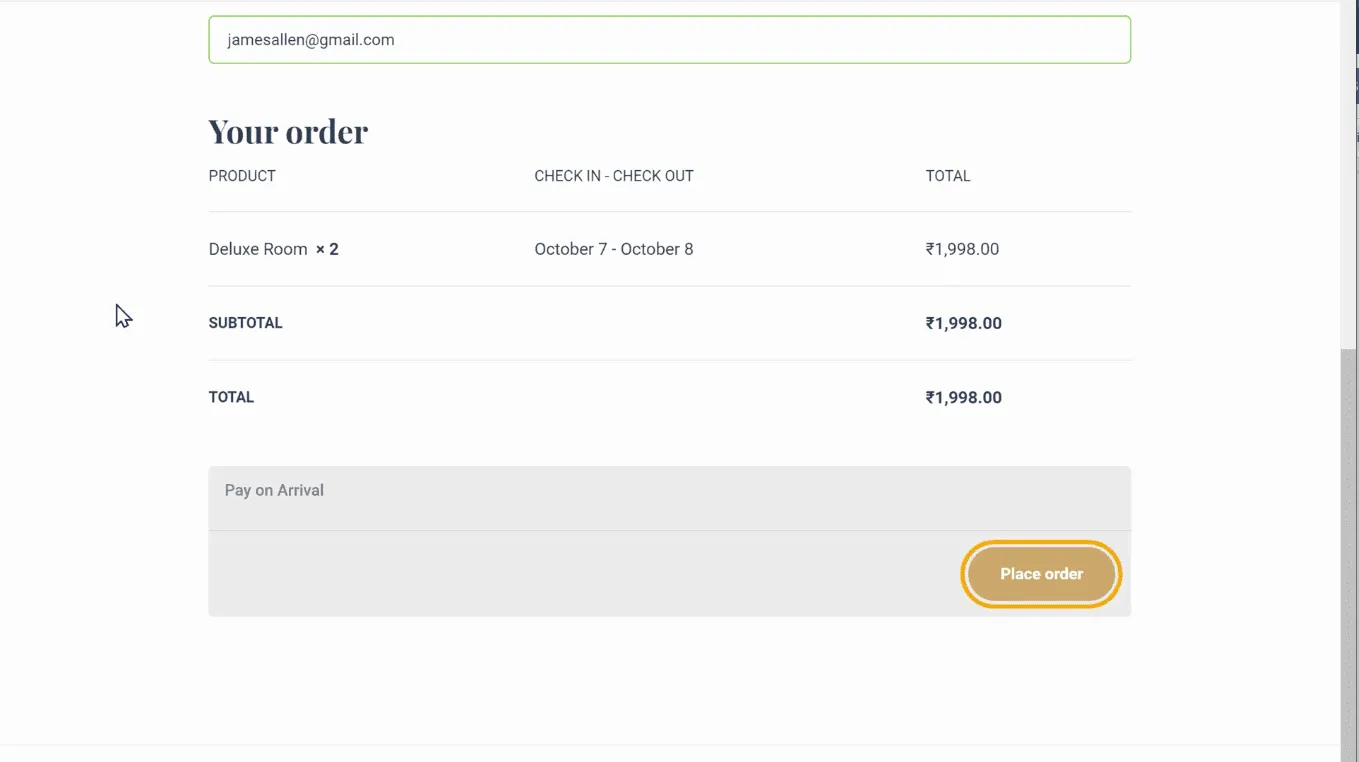 Now your customer can enter their details and scroll down. Here they can see that they can “pay on arrival”, which means your customers can make payment when they arrive at the hotel. Once they click ‘place order’, they can confirm the booking.