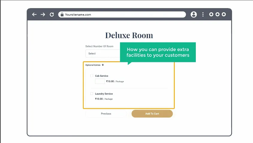 Now let’s check that by trying to book the room on your site. So go to ‘room’ and click refresh. Now click ‘Reservation’ and select ‘Check-in and Check-out date. Next, click ‘check available’, and you can see the paid services that you just added. Next, select the number of rooms and select the service you want. Once you are done, click ‘add to cart’.