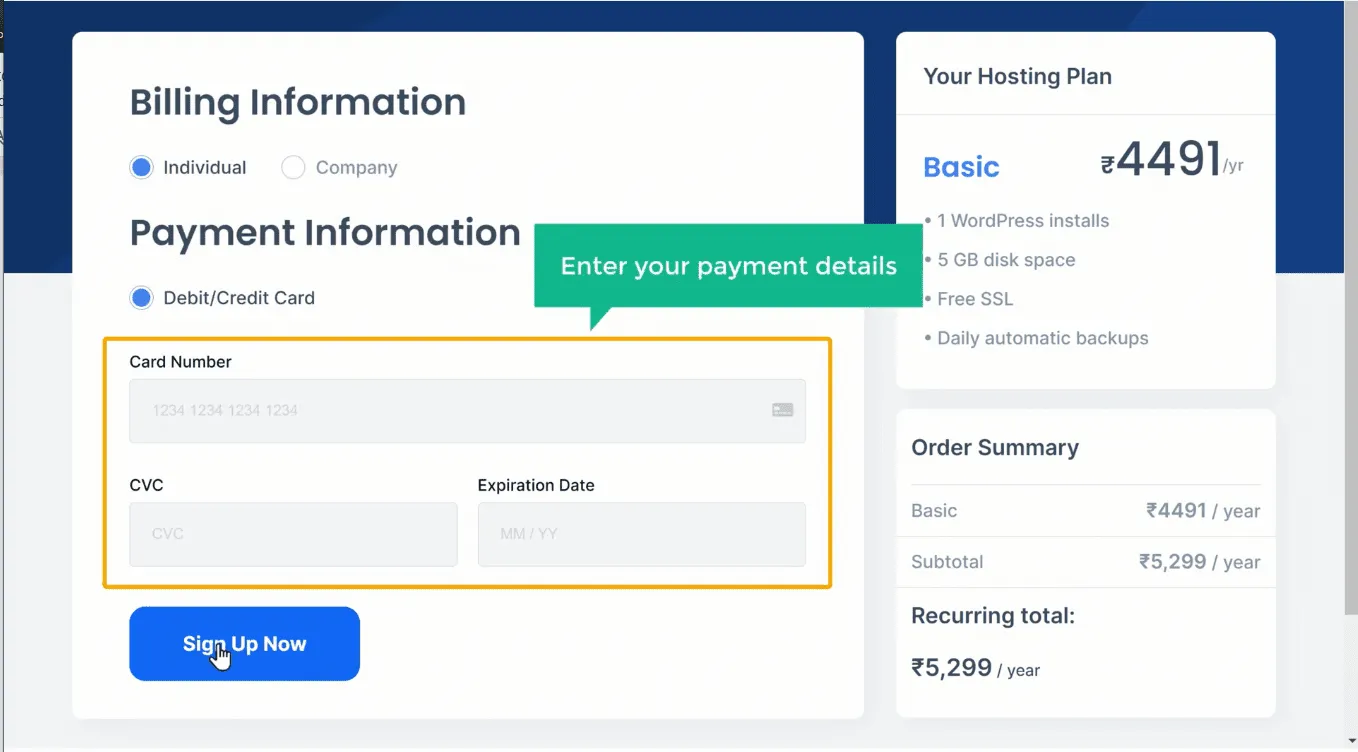 B: Enter your details and click next. Now enter your payment details and click Sign-Up.