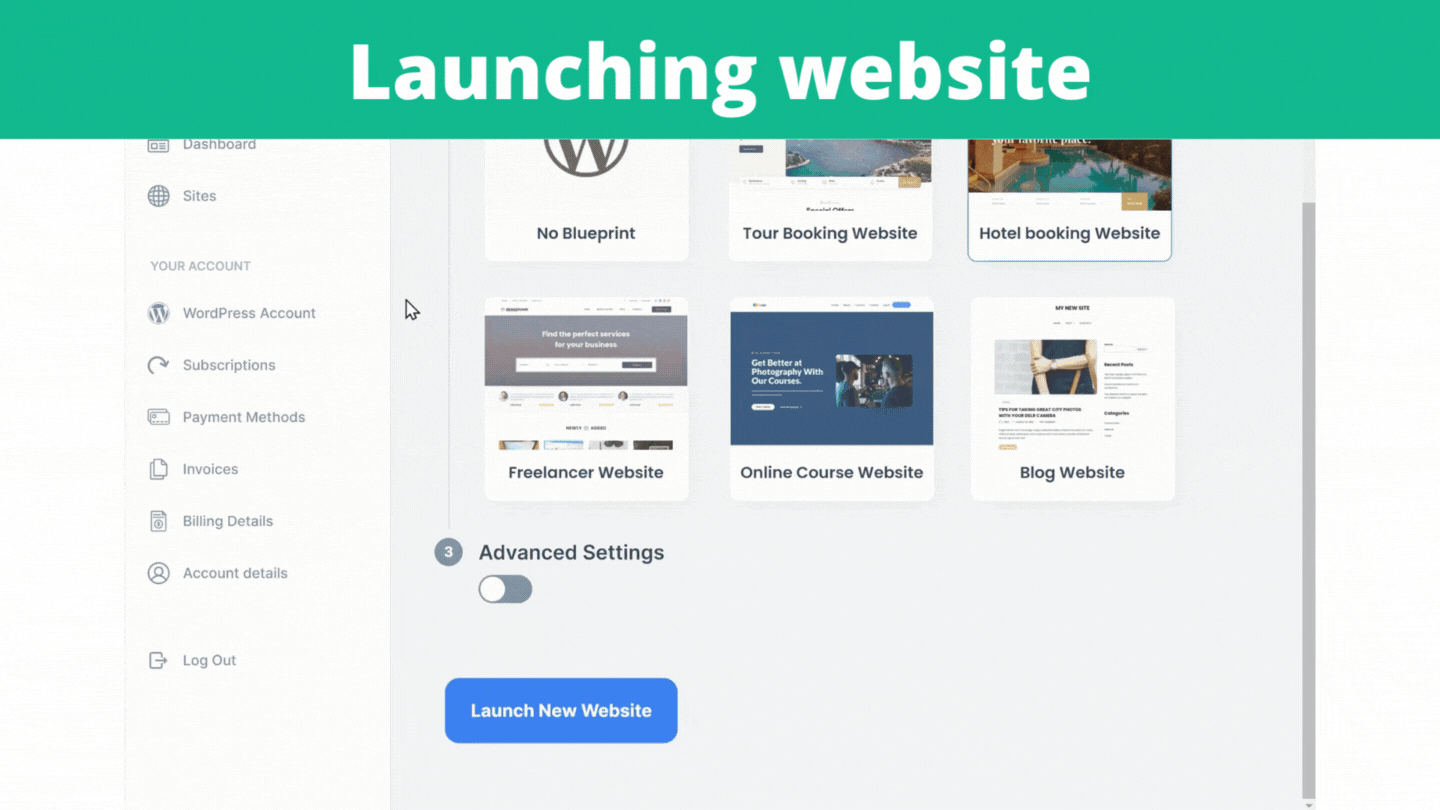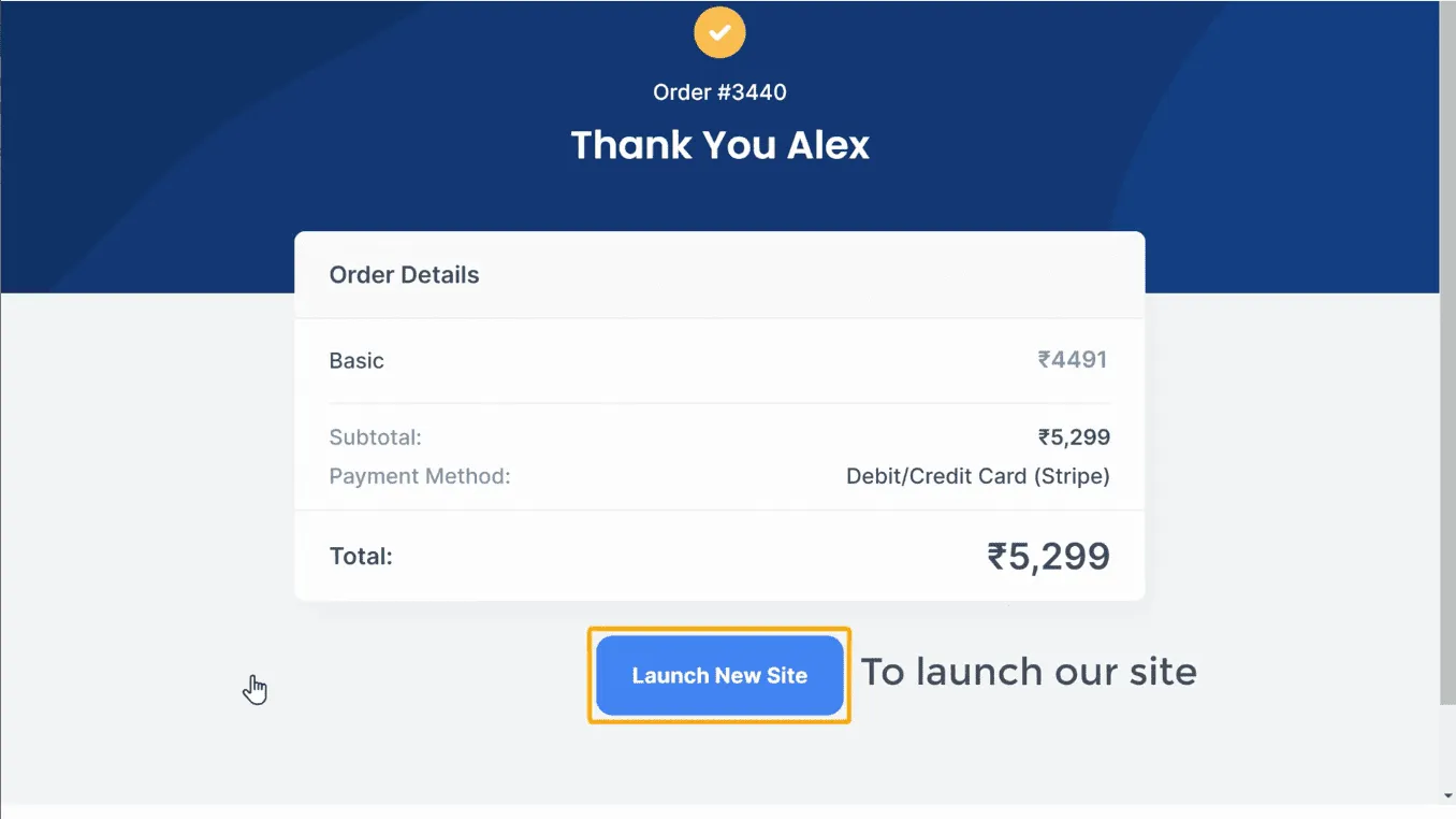 Now you’ve successfully purchased your website. Now to launch your site, scroll down and click “launch new site.”