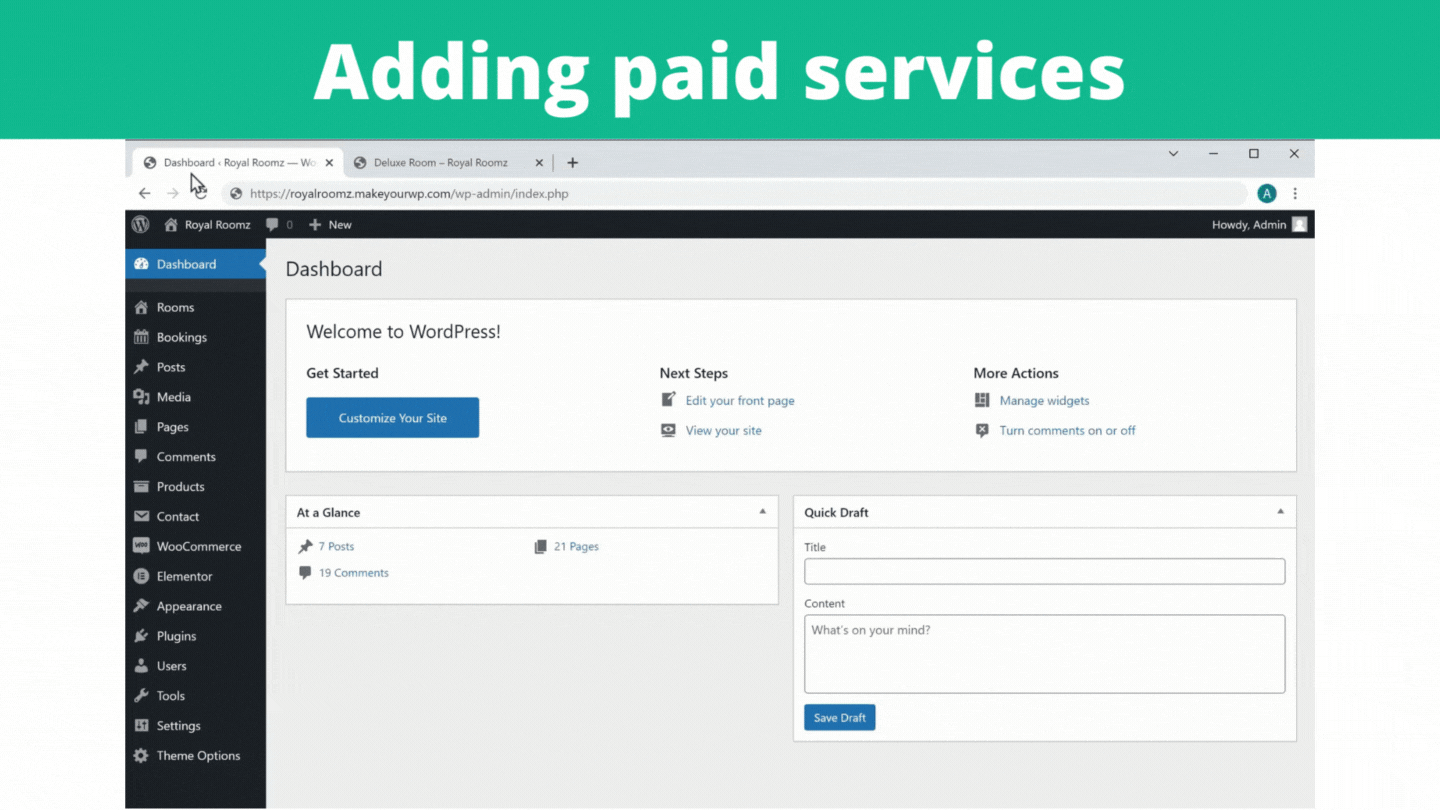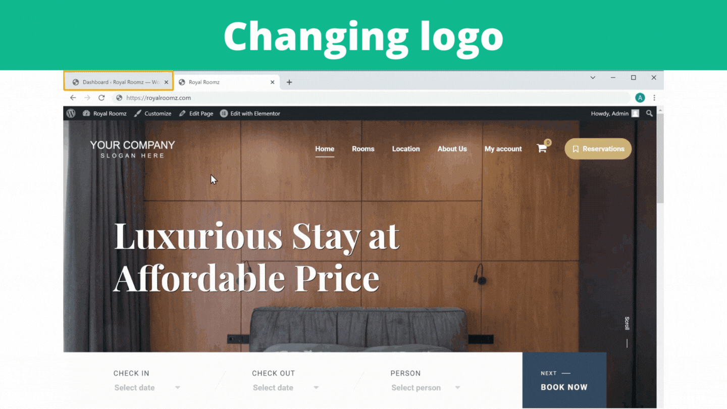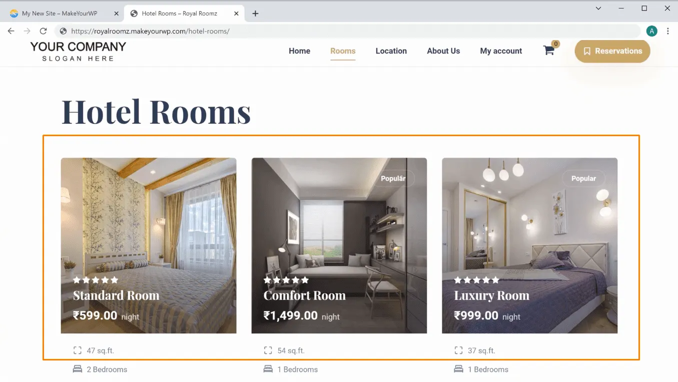 Now open a new tab and type your new domain name, royalroomz.com. You can see that you’ve got your hotel booking website which you just created. So now, your visitors & customers can go to your domain name to access your site and your rooms.