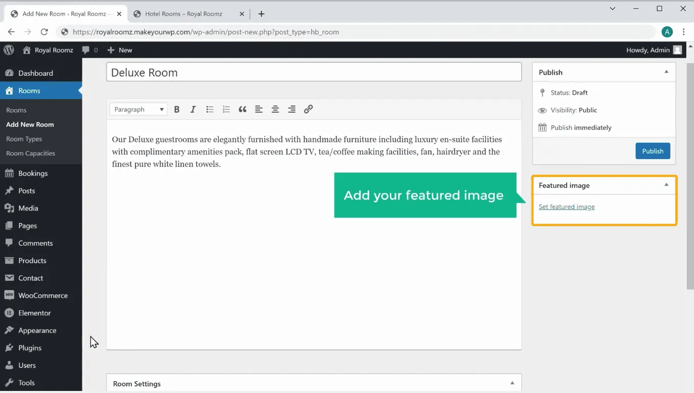 Once you set up your website, you can add rooms to your site, and your customers can book rooms. If you go to your site and then to ‘rooms’, you can see these sample rooms. Now instead of these sample rooms, you can add your rooms here.