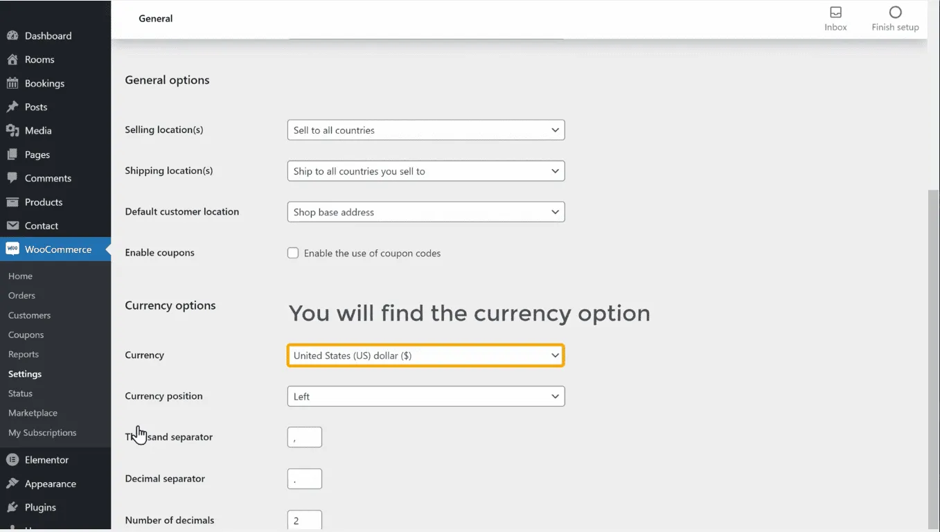 Now, instead of this currency if you want to have a different currency, then go to your dashboard. Now go to ‘woocommerce’ and click ‘settings’. If you scroll down, you can see the currency option. If you click here, you can see the available currencies. Just select the currency you want and click ‘Save changes’.