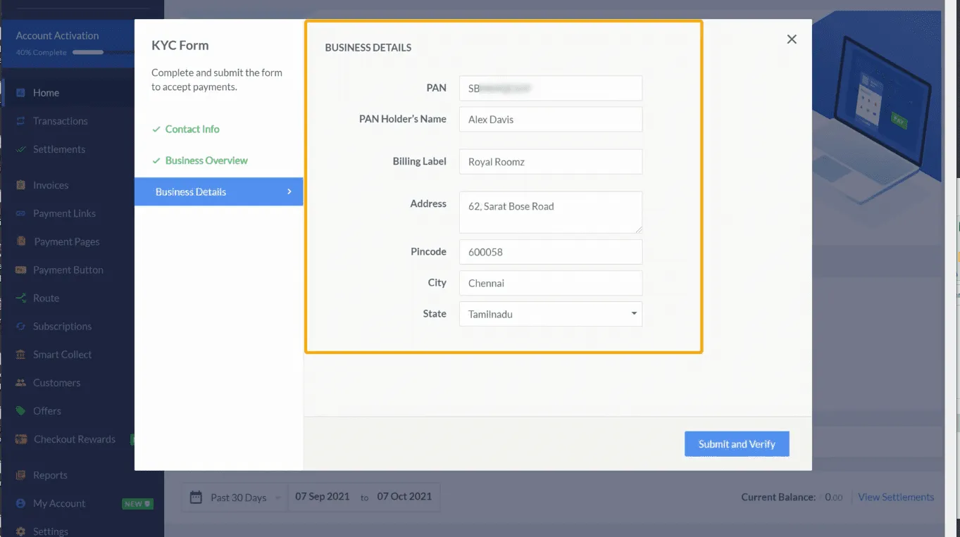 The next step is to enter your business details such as PAN, your business name, website name, address etc. Then, click, ‘Submit and verify’ once you fill in the details.