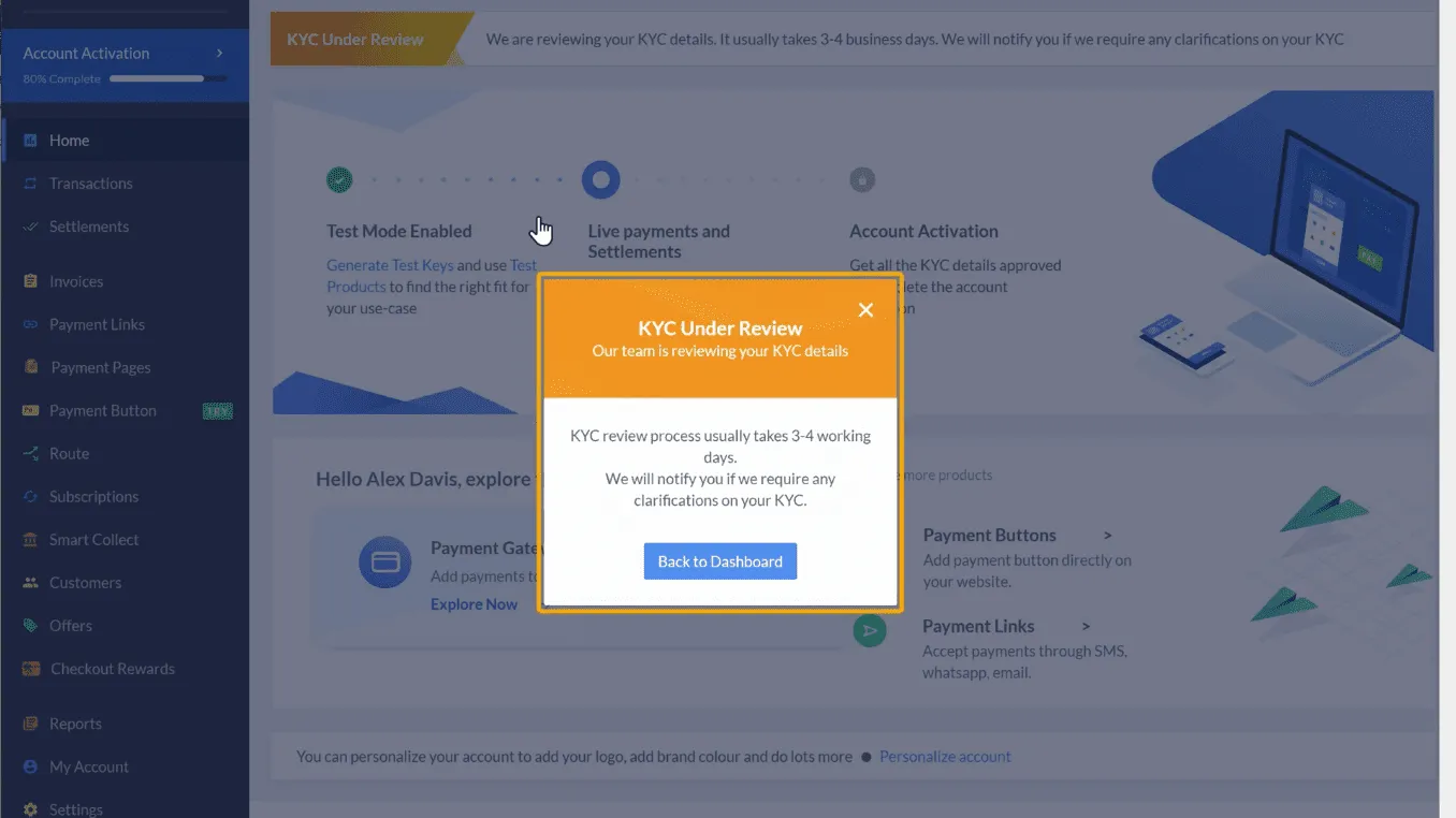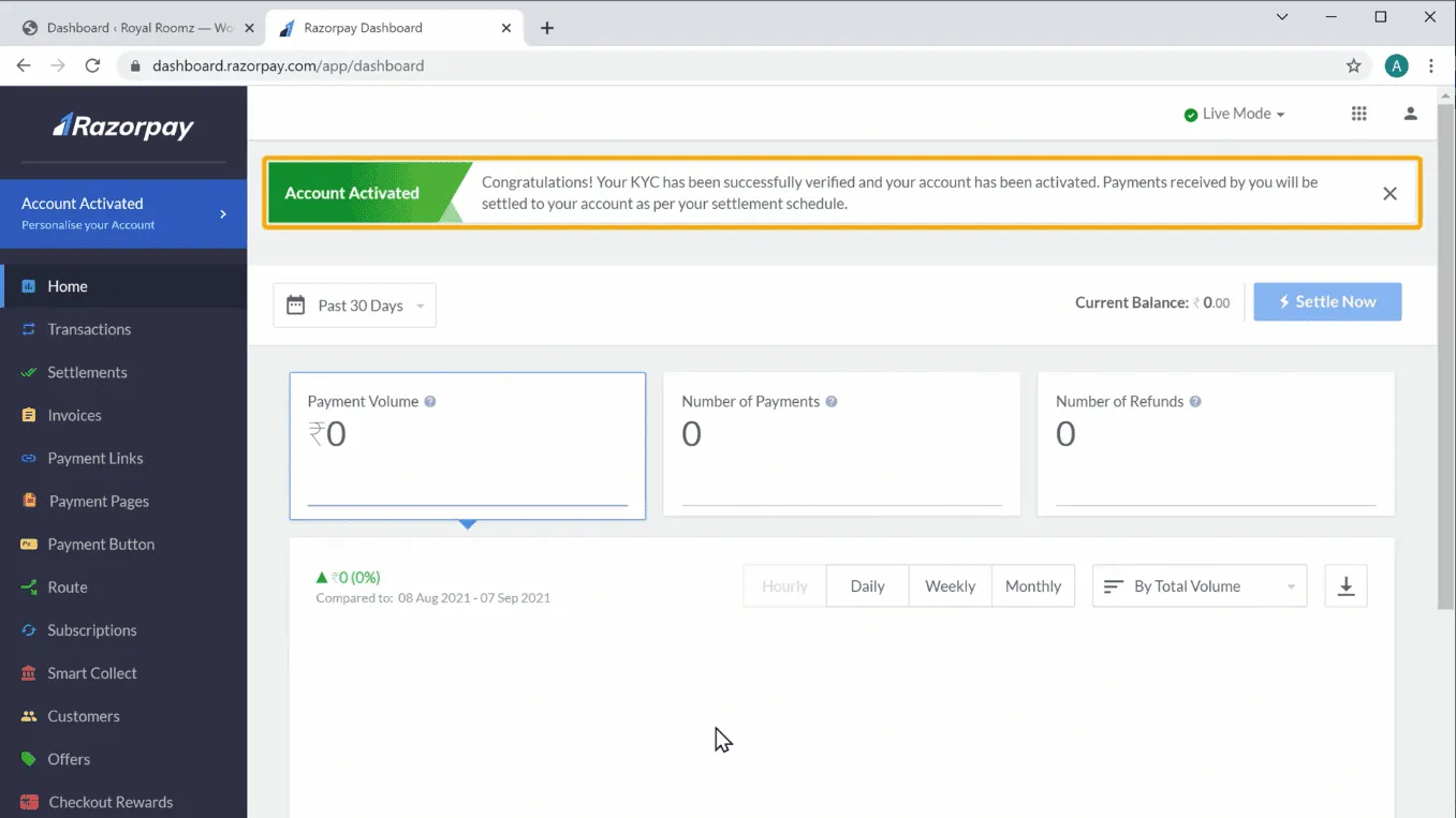 So after four days, if you go back to your account, you can see that your Razorpay account has been activated.