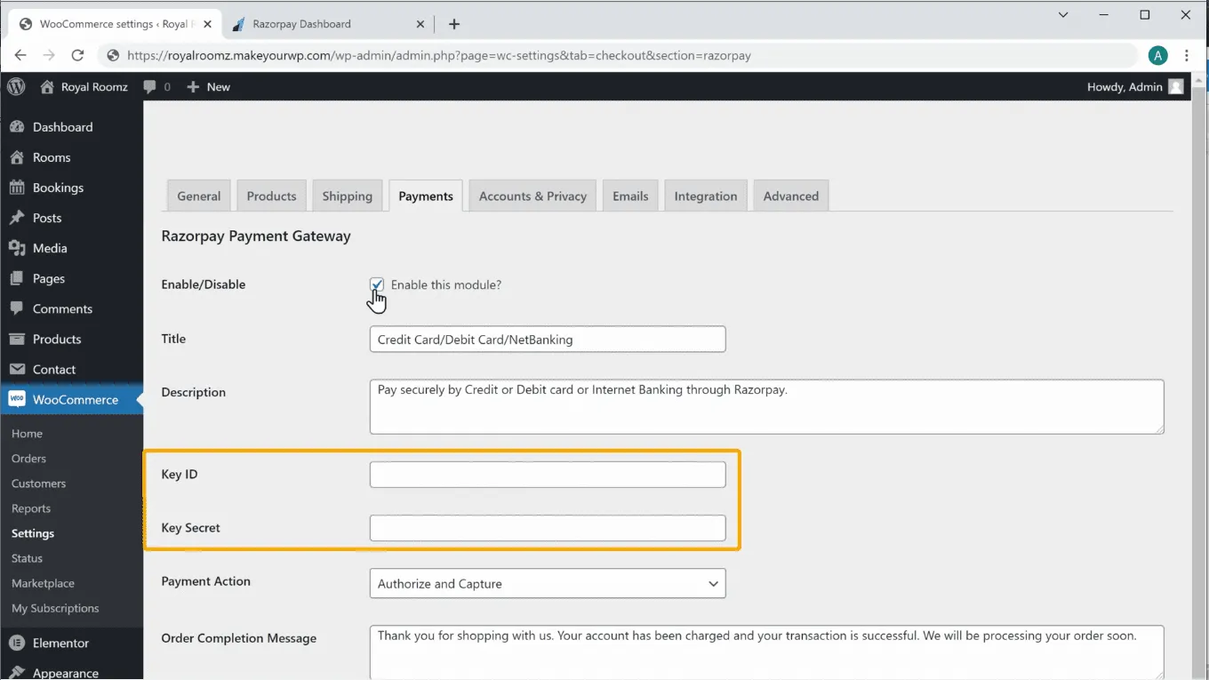 Let’s go to your wordpress dashboard, and go to ‘Woocommerce’. Click ‘settings’ and then click ‘payments’. Disable the ‘cash on delivery’ option and then click on Razorpay. It will take you to this tab, where you need to enable this option and API keys to connect the Razorpay account with your website.