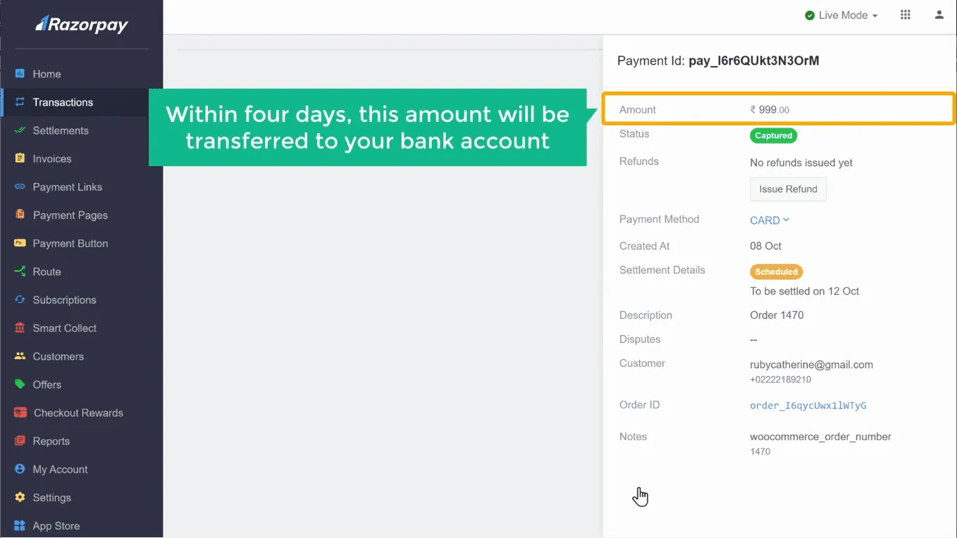 Once the order has been placed, you will receive two emails. The first email is from WordPress, which has the order details, and the second one is from Razorpay with the details of the payment. And within four days, this amount will be transferred to your bank account.