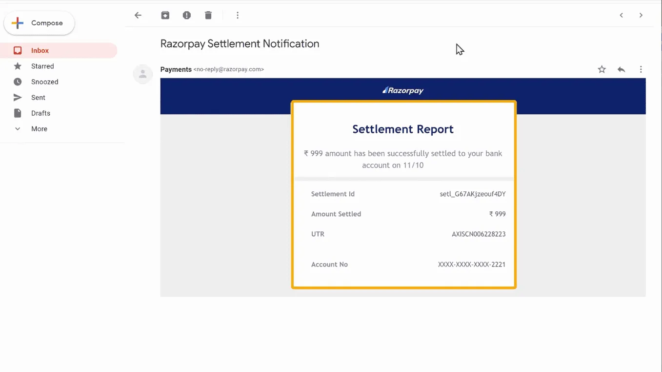 Now, after four days, if you open your inbox, you can see that you have got an email from Razorpay which says the payment has been transferred to your bank account.