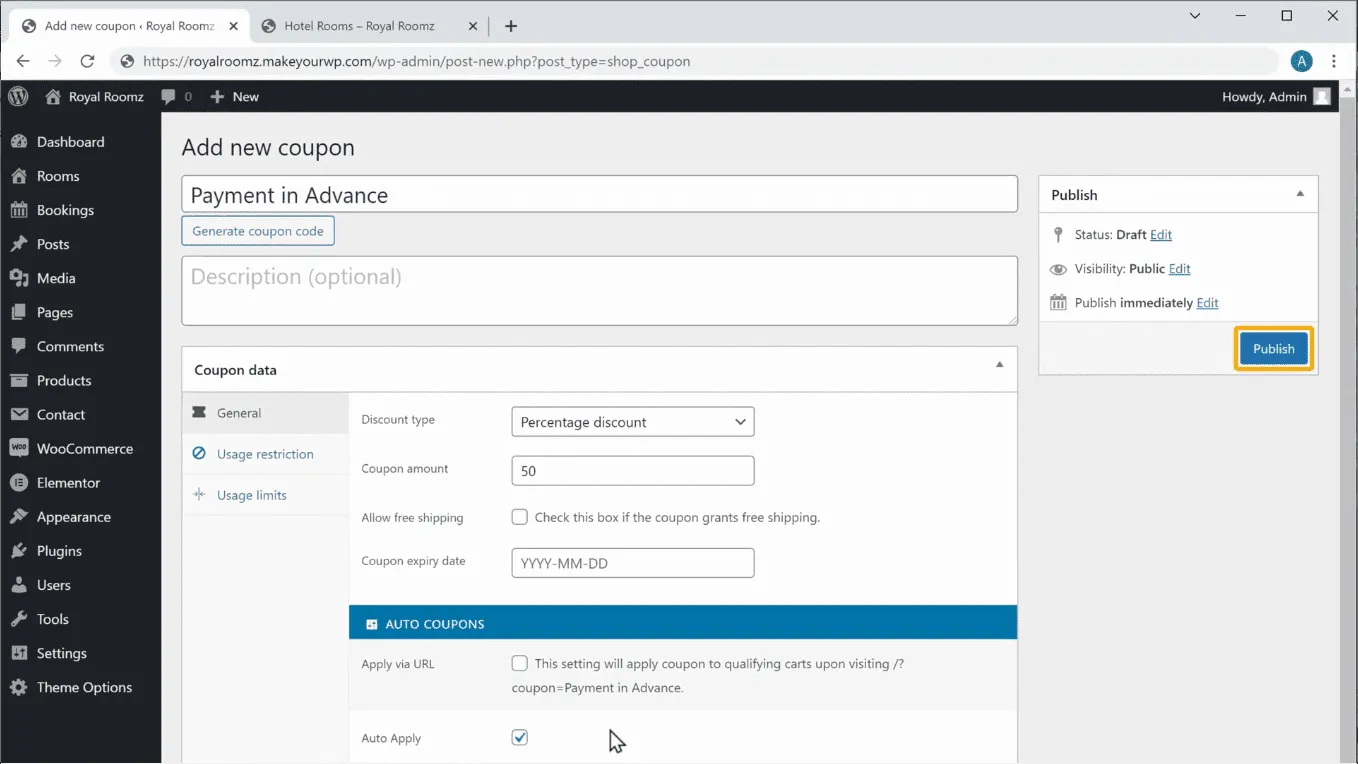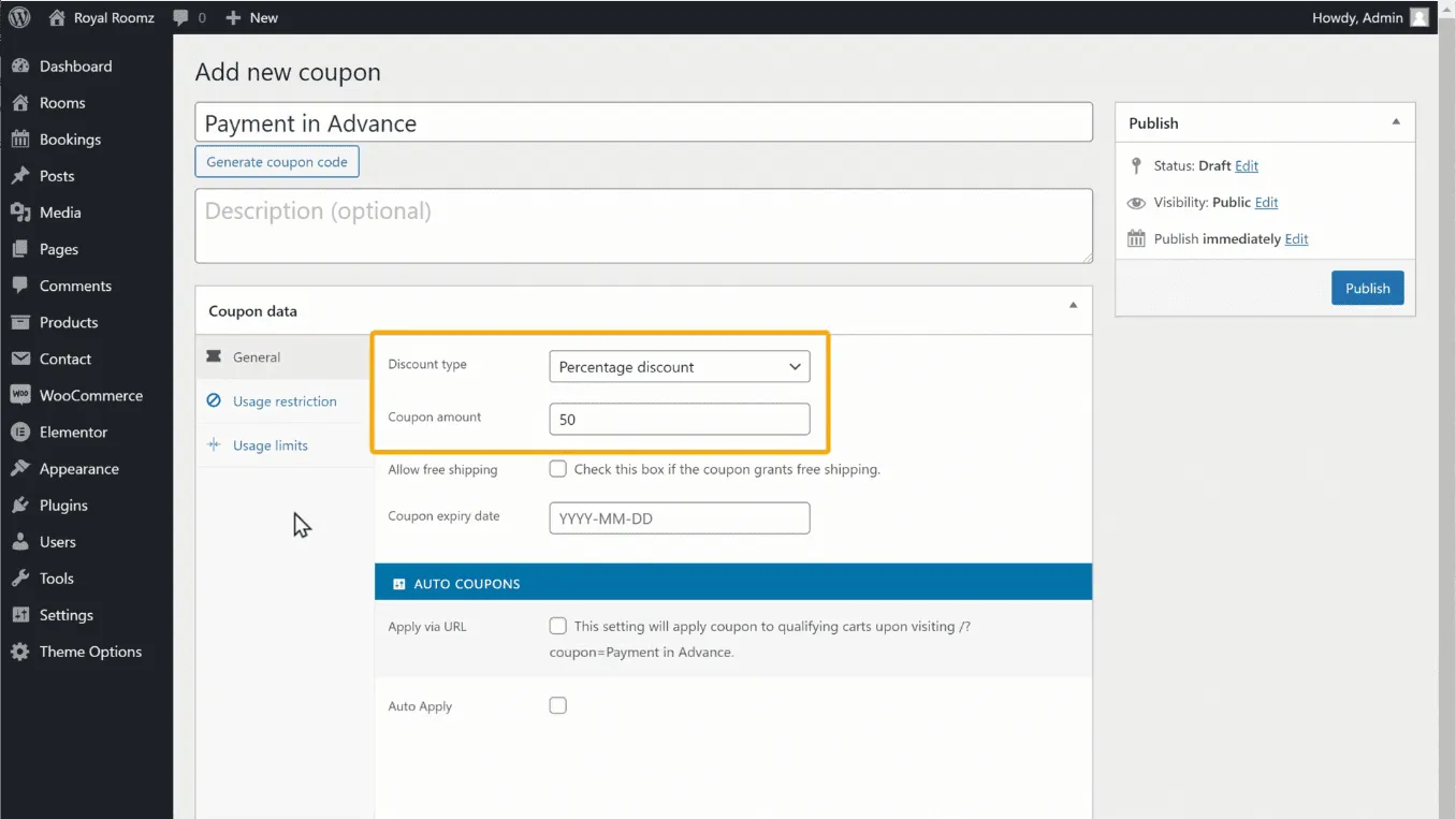 Let’s go to your dashboard and click ‘woo commerce’ and ‘coupons’ to get the payment in advance. Then click ‘add coupon’ and enter any name you want. Then select the percentage discount you want your customers to pay in advance. So a per cent of the amount can be spent on your site, and the balance per cent of the amount they can pay during the check-in time.