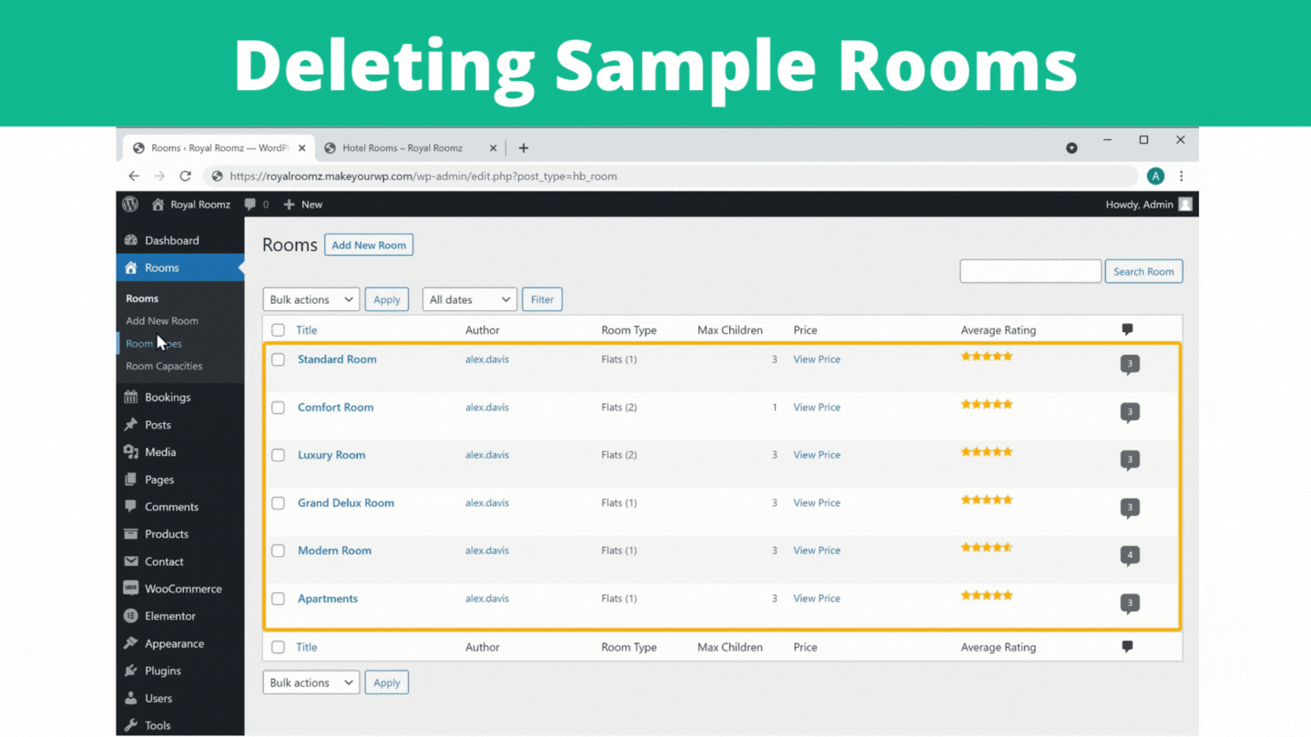 To delete the sample rooms click on ‘Rooms’, and here you can see some default rooms on your website. So to delete them, just click to select all the rooms and then select ‘Move to trash’. Now, if you click ‘apply’, you can see that all the sample rooms have been deleted.