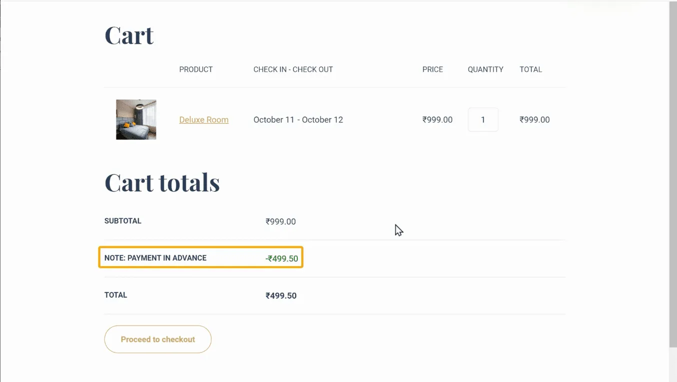So go to your site, click on this room, and click ‘reservation’. Select the “Check-in and Check-out date” and click ‘check available’. Select the number of rooms you want and click ‘add to cart’. You can see that the payment in advance has been added.