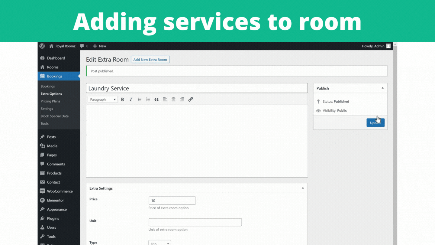 Next let’s see how you can add paid services/extra options for your customers, like cab service, laundry service, etc. So to add the services, go to your dashboard and go to ‘bookings’. Now click ‘extra options’ and click ‘Add new’. Next, enter the name of the service you want to add, and once you are done, click ‘publish’.
