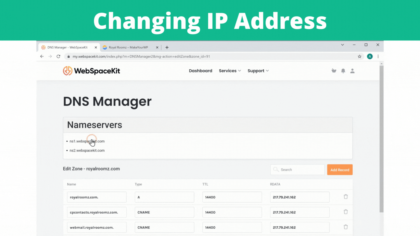 Now select the domain, which you purchased and then click ‘Manage DNS’. Next to the ‘A’ record, you need to add your IP address shown here. So let’s go back to this page, copy this IP Address, then come back to your domain and paste the IP address here. Once you are done, click ‘save changes’.