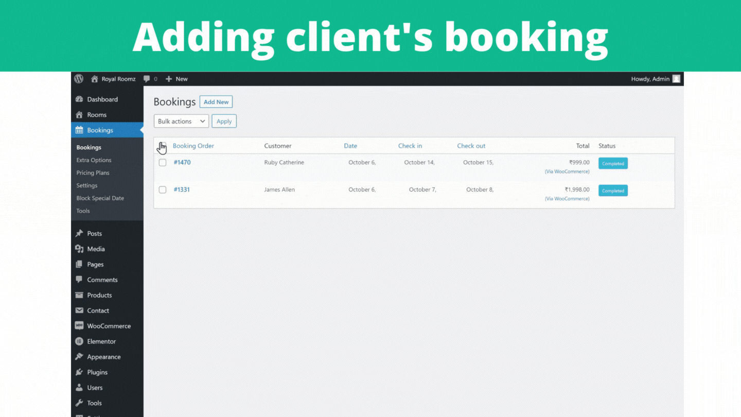 To add the booking you have received at your hotel, click ‘add new’, and you will get this page. Now click and select how your customer has made the payment. And then click to choose the booking status. Finally, just select ‘completed’ and enter the customer details if the booking is completed.