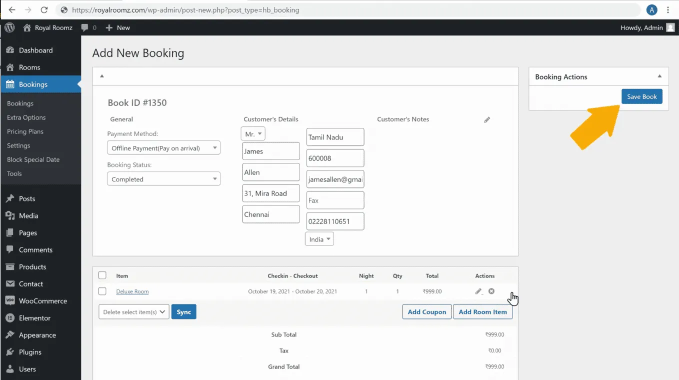 Now you need to select the number of rooms they have chosen. Finally, click ‘ádd’ if the booking is completed. Once you have added the booking, click ‘save book’, and the room will be booked for your customer.