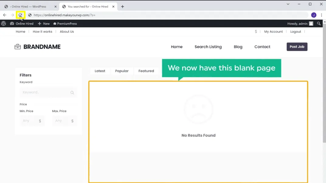 So now if you go to your site, and click Refresh. You can see that we have this blank page, which means you can now post new jobs.